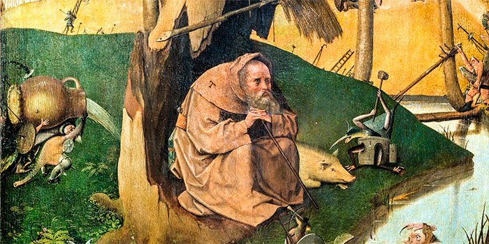 De acuerdo a los relatos de san Atanasio y de san Jerónimo, popularizados en el libro de vidas de santos La leyenda dorada que compiló el dominico genovés Santiago de la Vorágine en el siglo XIII, Antonio fue reiteradamente tentado por el demonio en el desierto. La tentación de san Antonio se volvió un tema favorito de la iconografía cristiana, representado por numerosos pintores de fuste.