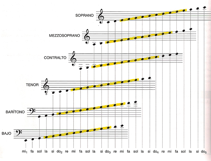 Por registro o tesitura vocal entendemos la gama de notas musicales que cada voz domina desde la más grave hasta la más aguda. Por esta condición, distinta en cada persona, la clasificación de voces denomina soprano a la voz más aguda, mezzosoprano a la voz intermedia y contralto a la voz más grave dentro de la cuerda femenina, mientras que en la cuerda masculina, el tenor posee la voz aguda, el barítono la voz media y el bajo la voz grave.