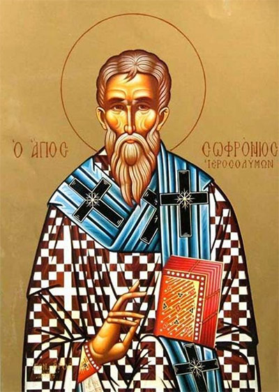 Martirologio Romano: En Jerusalén, san Sofronio, obispo, que tuvo como maestro y amigo a Juan Mosco, con quien visitó diversos lugares monásticos. Fue elegido, a la muerte de Modesto, para la sede de la Ciudad Santa, y en ella, cuando cayó en manos de los sarracenos, defendió valientemente la fe y la seguridad del pueblo. († 639)