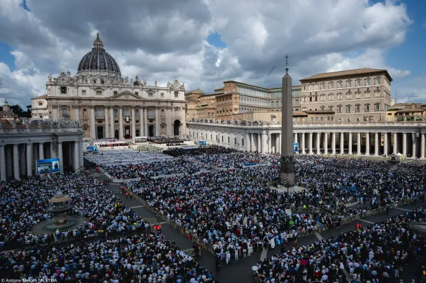 De repente, se oye un estruendo: el Papa León cruza la plaza en su papamóvil, y ya estallan espontáneamente vítores en toda la multitud, presa de la emoción. Un bosque de teléfonos se interpone en el camino del 267ᵉ Papa, que atraviesa toda la explanada, subiendo incluso por la Via della Conciliazione hasta el Castel Sant’Angelo, para ver a los últimos fieles que no han podido llegar a tiempo a la plaza de San Pedro; en total, las autoridades italianas cuentan 200 mil participantes. A continuación, el Pontífice regresó a la basílica.