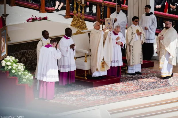 Casi media hora después, las pantallas repartidas por la plaza empezaron a retransmitir el interior de la basílica, donde comenzó la celebración. León XIV apareció en las pantallas y recibió una gran ovación cuando descendió a la Confesión de Pedro, la «gruta» situada en el corazón de la basílica. Allí, rodeado de los jefes de las numerosas Iglesias orientales vinculadas a Roma, observó un momento de oración ante la tumba del jefe de los apóstoles, de quien se había convertido en sucesor.