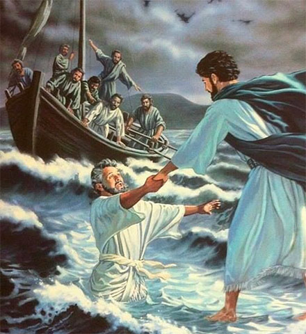 Entrada la noche, la barca estaba en medio del lago y Jesús, solo, en tierra. Viendo los trabajos con que avanzaban, pues el viento les era contrario, se dirigió a ellos caminando sobre el agua, poco antes del amanecer, y parecía que iba a pasar de largo.