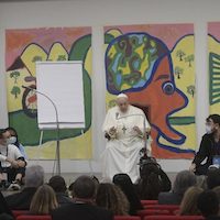 La tarde del jueves 25 de noviembre Francisco conversó con unos 50 jóvenes de Scholas Occurrentes en un encuentro organizado en el Pontificio Colegio Internacional Maria Mater Ecclesiae, de Roma, que estuvo marcado por un ambiente de diálogo y fraternidad en el que el Pontífice profundizó sobre varios de los temas más críticos y actuales de la agenda internacional. Ante la presencia de los directores mundiales de Scholas, José María del Corral y Enrique Palmeyro, acompañados de chicos y chicas de entre 16 y 27 años en representación de unos cincuenta países del mundo; el Pontífice respondió a algunas preguntas que le plantearon, después de haber compartido con ellos canciones y testimonios, así como una representación teatral, en la que los jóvenes, ataviados con máscaras blancas con rayas de colores, simbolizaron «el dolor» que aflige a la juventud actual.