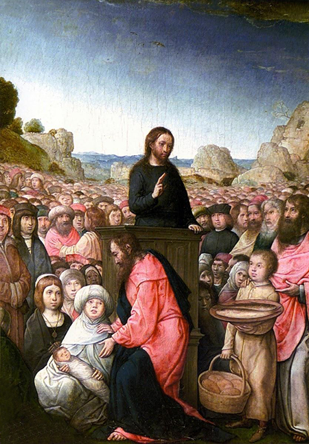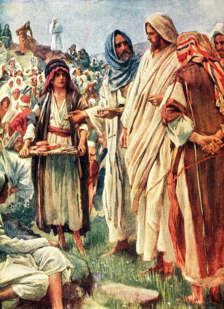 Al principio, los discípulos se negaban a servir a la multitud, prefiriendo enviarlos a los pueblos vecinos y que se arreglaran por sí mismos. En el punto culminante de esta historia, los discípulos se convierten ellos mismos en dadores de alimentos, poniendo los panes y los peces ante la gente. Dentro del círculo de la gracia, descubren su misión, se enriquecen, se transfiguran.