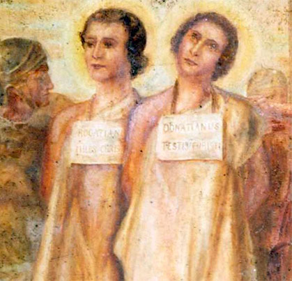 El juez lo encarceló. Después se dirigió a Rogaciano diciéndole: «Mira, tú no te has bautizado todavía. Abjura de tu error y te salvaré la vida». Rogaciano le contestó:» Nunca lo haré. Seguiré a mi hermano mayor en la fe que él ha profesado en el Dios verdadero. En el calabozo, el hermano le dio el bautismo a falta de sacerdote.