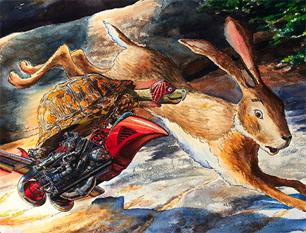 Pero la historia tampoco termina aquí: Tras ser derrotada, la tortuga reflexionó detenidamente y llegó a la conclusión de que no había forma de ganarle a la liebre en velocidad. Como estaba planteada la carrera, ella siempre perdería; por eso desafió nuevamente a la liebre, pero propuso correr sobre una ruta ligeramente diferente. La liebre aceptó y corrió a toda velocidad, hasta que se encontró en su camino con un ancho río. Mientras la liebre, que no sabía nadar, se preguntaba «¿qué hago ahora?» la tortuga nadó hasta la otra orilla, continuó a su paso y terminó en primer lugar.