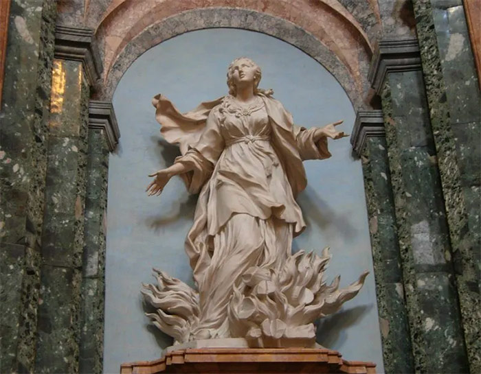 Ante todo esto, la condenaron a morir desnuda en la hoguera. Pero las llamas se dividieron bajo su cuerpo sin siquiera tocarlo, y su cabello creció tanto como para cubrir su desnudez.