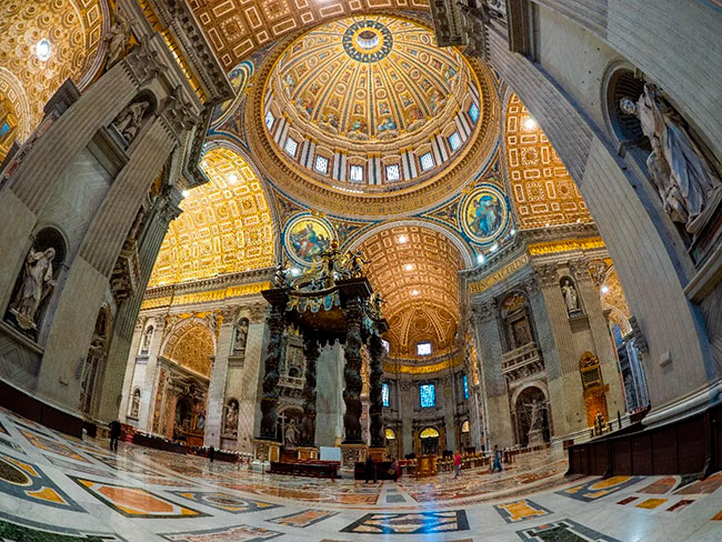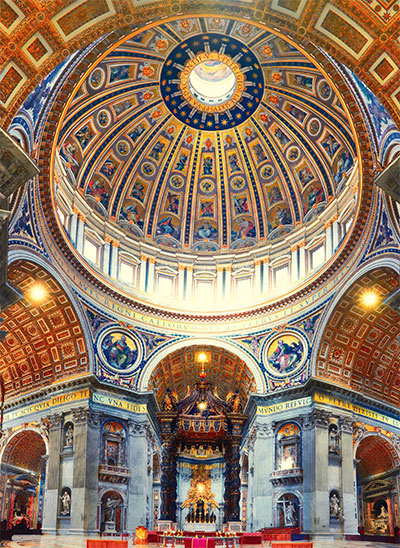 Su construcción la empezó el Papa Nicolás V en 1454, y la terminó y consagró el Papa Urbano VIII en 1626 (170 años construyéndola). Trabajaron en ella los más famosos artistas como Bramante, Rafael, Miguel Angel y Bernini. Su hermosura es impresionante.