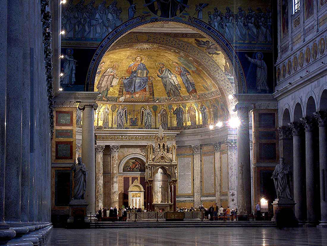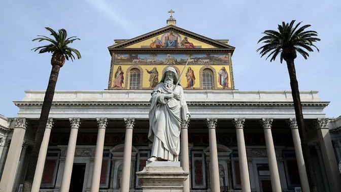 Hoy recordamos también la consagración de la Basílica de San Pablo, que está al otro lado de Roma, a 11 kilómetros de San Pedro, en un sitio llamado «Las tres fontanas», porque la tradición cuenta que allí le fue cortada la cabeza a San Pablo y que al cortársela cayó al suelo y dio tres golpes y en cada golpe salió una fuente de agua (y allí están las tales tres fontantas).