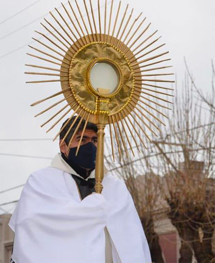 1378 –«El culto de la Eucaristía. En la liturgia de la misa expresamos nuestra fe en la presencia real de Cristo bajo las especies de pan y de vino, entre otras maneras, arrodillándonos o inclinándonos profundamente en señal de adoración al Señor. “La Iglesia católica ha dado y continua dando este culto de adoración que se debe al sacramento de la Eucaristía no solamente durante la misa, sino también fuera de su celebración: conservando con el mayor cuidado las hostias consagradas, presentándolas a los fieles para que las veneren con solemnidad, llevándolas en procesión” (Mysterium fidei 56).
