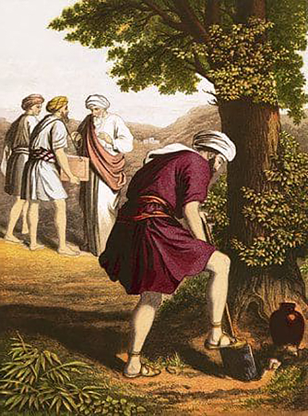 Durante la ausencia del señor, los tres siervos deben hacer rendir este patrimonio. El primero y el segundo siervo doblan cada uno el capital de partida; el tercero, en cambio, por miedo a perderlo todo, entierra el talento recibido en un hoyo. A la vuelta del amo, los dos primeros reciben alabanza y recompensa, mientras que el tercero, que devuelve sólo la moneda recibida, es recriminado y castigado.