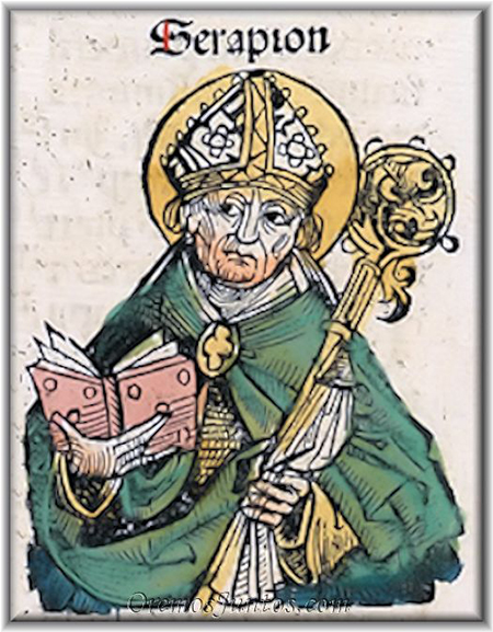 A este monje egipcio se le conoce también como Serapión de Thmuis. La fecha de su muerte se sitúa más o menos entre los años 365 y 370. Las características que mejor lo definen son, sin duda, su penetrante inteligencia y su elocuencia. Gracias a ellas tuvo en la Iglesia un papel relevante. Estudió en la célebre escuela catequética de Alejandría. Después se dedicó a la vida eremítica. En este campo tuvo un maestro excepcional, san Antonio. A nivel intelectual, encontró en san Atanasio un amigo sincero. Lo recuerda con cariño en su libro “Vida de san Antonio. Al separase, le dejó su túnica. Lo nombraron obispo de Thmuis en el delta del Nilo. Se le reconoció en seguida por su carácter de dirigente en los asuntos eclesiásticos y por su clara y transparente oposición al arrianismo. El propio san Jerónimo lo eligió como confesor. Por su vida pastoral como cabeza de la diócesis rondaba la idea de escribir un libro magnífico contra los maniqueos. Defiende en contra de ellos la doctrina de que nuestros cuerpos son instrumentos para el bien o para el mal. Todo depende de la disposición del corazón. Los maniqueos sostienen que el alma es obra de Dios, pero nuestros cuerpos lo son del diablo. También escribió varias cartas y un libro basado en los títulos de los Salmos, pero no queda ninguno. En el año 1899 se descubrió el libro más conocido sobre los santos, llamado Eucologio. Es una colección litúrgica de oraciones que él mismo empleó cuando era obispo. Es interesante para conocer la adoración y la fe de los primeros cristianos egipcios. Frecuentemente repetía esta expresión llena de contenido:»La mente se purifica por el conocimiento, las pasiones espirituales del alma con la caridad y los apetitos desordenados con la abstinencia y la penitencia..» ¡Felicidades a quien lleve este nombre!