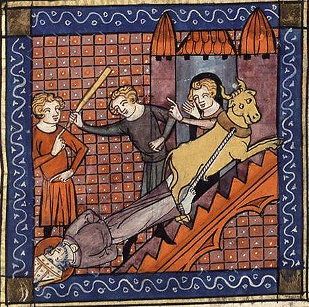 Los relatos siguientes lo presentan atado con cuerdas a un toro que estaba dispuesto para ser sacrificado y que lo arrastra hasta dejarlo muerto y destrozado.
