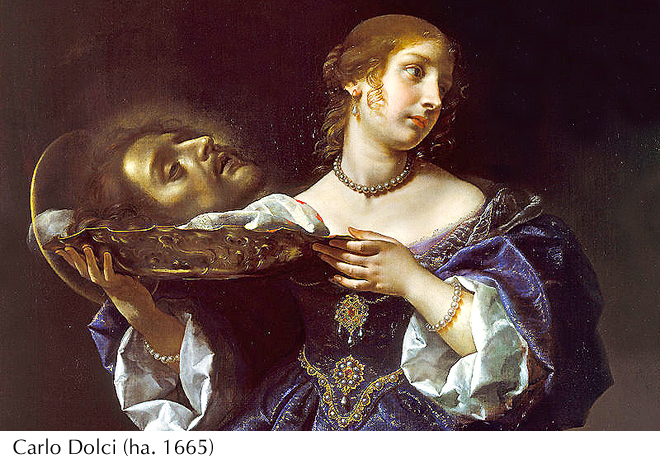 «Pero llegó el día oportuno, cuando Herodes en su cumpleaños dio un gran banquete a todos los principales de la ciudad. Entró a la fiesta la hija de Herodías y bailó, el baile le gustó mucho a Herodes, y le prometió con juramento: «Pídeme lo que quieras y te lo daré, aunque sea la mitad de mi reino».