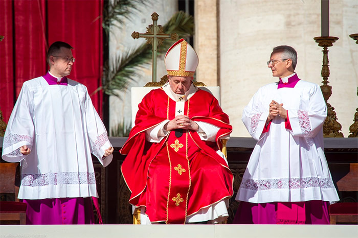 Papa Francisco presidió sentado toda la celebración y quiso hablar, en su homilía del Calvario y de dos mentalildades que se enfrentan. Las palabras de Jesús y las de los que lo crucifican. “El sálvate a ti mismo discuerda con el Salvador que se ofrece a sí mismo”, explicó el Papa: “En el Evangelio de hoy también Jesús, como sus opositores,  toma la palabra tres veces en el Calvario (cf. vv. 34.43.46). Pero en ningún caso reivindica algo para  sí; es más, ni siquiera se defiende o se justifica a sí mismo. Reza al Padre y ofrece misericordia al  buen ladrón. Una expresión suya, en particular, marca la diferencia respecto al sálvate a ti mismo:  «Padre, perdónalos» (v. 34).”