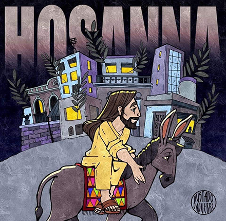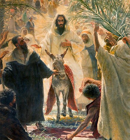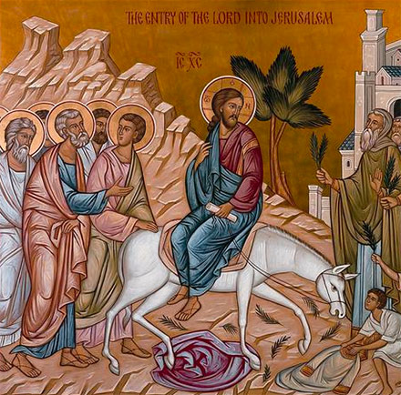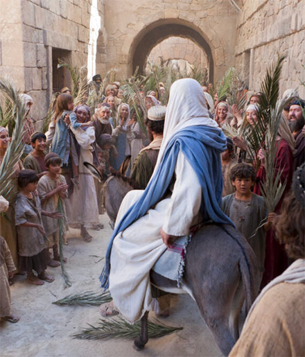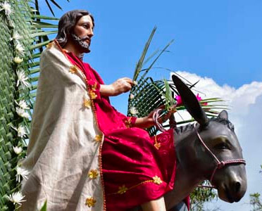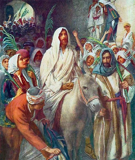 Cuando llegaba a Jerusalén para celebrar la pascua, Jesús les pidió a sus discípulos traer un burrito y lo montó. Antes de entrar en Jerusalén, la gente tendía sus mantos por el camino y otros cortaban ramas de árboles alfombrando el paso, tal como acostumbraban saludar a los reyes.