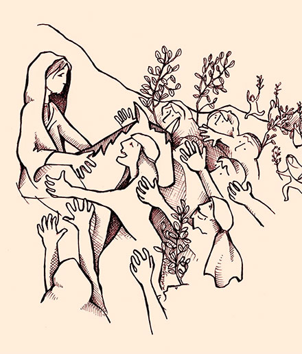 Mientras lo llevaban a crucificar, echaron mano a un cierto Simón de Cirene, que volvía del campo, y lo obligaron a cargar la cruz, detrás de Jesús. Lo iba siguiendo una gran multitud de hombres y mujeres, que se golpeaban el pecho y lloraban por él. Jesús se volvió hacia las mujeres y les dijo: “Hijas de Jerusalén, no lloren por mí; lloren por ustedes y por sus hijos, porque van a venir días en que se dirá: ‘ Dichosas las estériles y los vientres que no han dado a luz y los pechos que no han criado!’ Entonces dirán a los montes: ‘Desplómense sobre nosotros’. y a las colinas: ‘Sepúltennos’, porque si así tratan al árbol verde, ¿qué pasará con el seco?”.