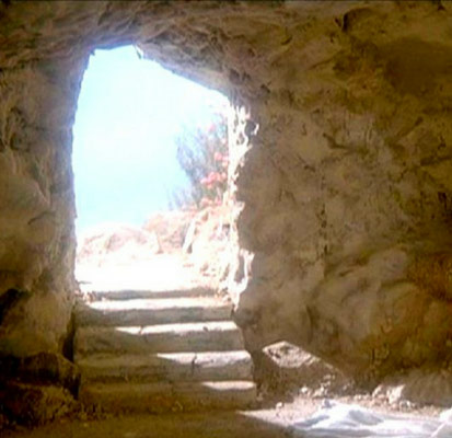 La roca había sido retirada de la entrada. Esta roca, que bloqueaba la entrada al sepulcro de Jesús, representa el carácter final de la muerte. Cuando alguien al que amamos muere, es como si una gran roca hubiera sido corrida entre nosotros, bloqueando permanentemente nuestro acceso a ellos. Es por esta razón que lloramos ante la muerte —no sólo por el dolor, sino también por una suerte de frustración existencial.