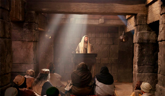 Enrolló el volumen, lo devolvió al encargado y se sentó. Los ojos de todos los asistentes a la sinagoga estaban fijos en él. Entonces comenzó a hablar, diciendo: “Hoy mismo se ha cumplido este pasaje de la Escritura que acaban de oír”.
