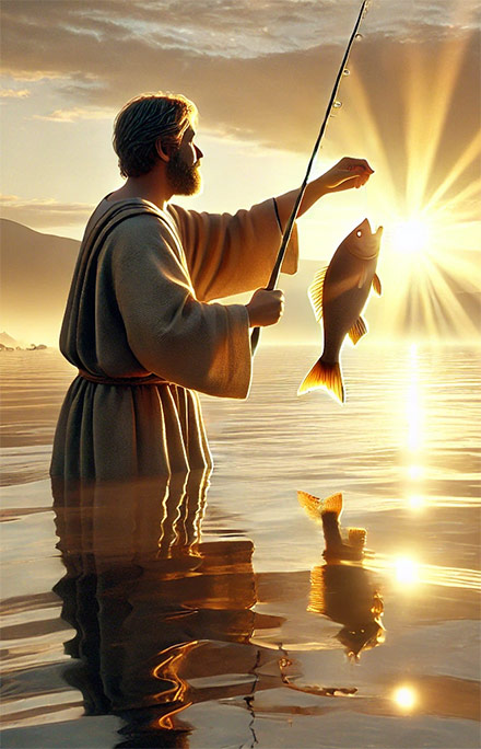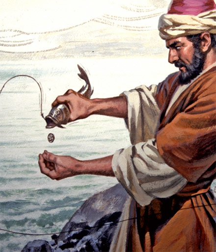 Al entrar Pedro en la casa, Jesús se adelantó a preguntarle: “¿Qué te parece, Simón? ¿A quiénes les cobran impuestos los reyes de la tierra, a los hijos o a los extraños?” Pedro le respondió: “A los extraños”. Entonces Jesús le dijo: “Por lo tanto, los hijos están exentos. Pero para no darles motivo de escándalo, ve al lago y echa el anzuelo, saca el primer pez que pique, ábrele la boca y encontrarás una moneda. Tómala y paga por mí y por ti”.