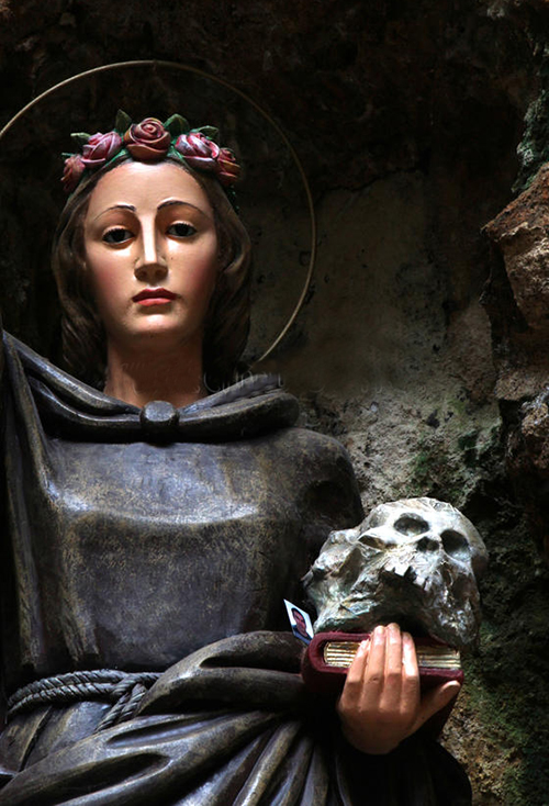 Sus principales atributos son: una corona de rosas, en alusión a su nombre; y un crucifiJo y una calavera, por su ascesis.