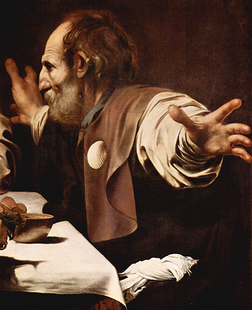 Al acercarse a la aldea, el caminante hace intención de proseguir. Cleofás y su amigo le insistieron: «Quédate con nosotros, que el día ya declina». El caminante accedió, entró con ellos en la casa, se sentó a la mesa, tomó el pan, lo bendijo, lo partió en trozos, y se lo dio. En este instante le reconocieron.-