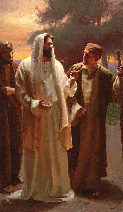 Se les unió un caminante como compañero de camino. Ellos temían «ofuscada la mirada». Al preguntar qué les pasa, Cleofás con tono enojado casi le regañó por no estar al día de lo que ha pasado en la Ciudad Santa. Cuando resumen los hechos tan trágicos e impresionantes, el viajero les recordó que ya estaba previsto por los profetas.-