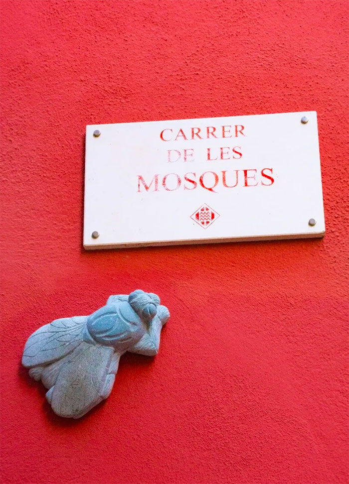 En las calles de Girona pueden verse todavía hoy los detalles de moscas de piedra en algunas paredes del casco histórico de la ciudad. Una de ellas está precisamente en la calle de las Moscas.