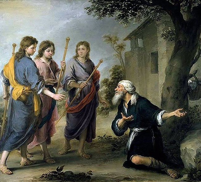 «Apareciósele Yahveh [a Abraham] en la encina de Mambré … Levantó los ojos y he aquí que había tres individuos parados a su vera. Como los vio acudió desde la puerta de la tienda a recibirlos, y se postró en tierra … Luego tomó cuajada y leche, junto con el becerro que había aderezado, y se lo presentó, manteniéndose en pie delante de ellos bajo el árbol» (Génesis 18, 1-8).