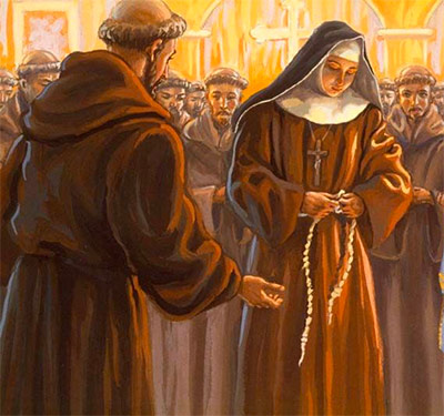 Santa Clara oyó predicar a San Francisco y decidió seguirlo en 1212. San Francisco consiguió que Santa Clara y sus compañeras se establecieran en San Damián. La oración de éstas hacía fecundo el trabajo de los franciscanos.