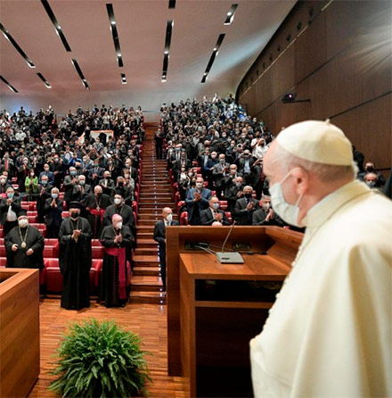 El Papa habla en el Aula Magna del Ateneo, a donde llegó a las 9 horas, recibido con aplausos y el saludo del Gran Canciller, el cardenal vicario Angelo De Donatis. Junto a él, Audrey Azoulay, directora general de la UNESCO, y el Patriarca Bartolomé de Constantinopla, que se encuentra en Roma desde el pasado lunes para firmar con otros líderes religiosos un llamamiento conjunto destinado a curar una humanidad y una Tierra heridas.