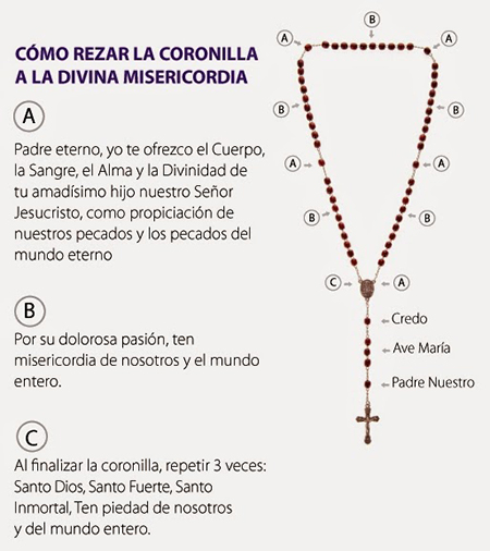 «Alienta a las personas a decir la Coronilla que te he dado. (…)Quien la recite recibirá gran misericordia a la hora de la muerte. Los sacerdotes la recomendarán a los pecadores como su último refugio de salvación. Aún si el pecador más empedernido hubiese recitado esta Coronilla al menos una vez, recibirá la gracia de Mi infinita Misericordia. Deseo conceder gracias inimaginables a aquellos que confían en Mi Misericordia» (Diario de Santa Faustina).