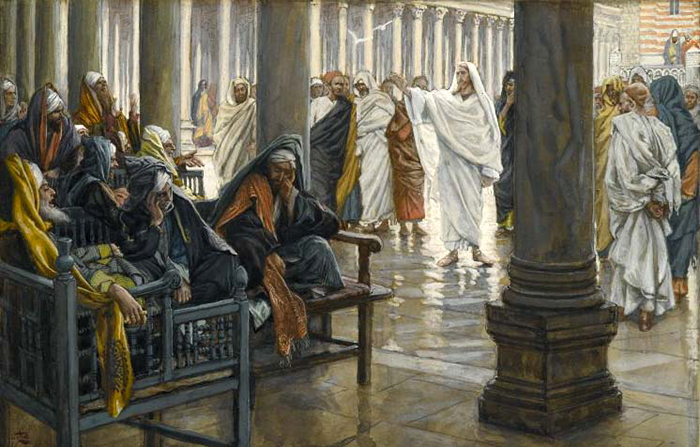 Después reúne en su crítica a fariseos y escribas; es decir, a los que presumen de cumplir la ley, tanto si son doctos como si no lo son. «En la cátedra de Moisés se han sentado los escribas y fariseos. Haced y cumplid todo cuanto os digan; pero no hagáis según sus obras, pues dicen pero no hacen. Atan cargas pesadas e insoportables y las ponen sobre los hombros de los demás, pero ellos ni con un dedo quieren moverlas. Hacen todas sus obras para ser vistos por los hombres; ensanchan sus filacterias y alargan sus franjas. Apetecen los primeros puestos en los banquetes, los primeros asientos en las sinagogas y los saludos en las plazas, y que la gente les llame Rabí. Vosotros, al contrario, no os hagáis llamar Rabí, porque sólo uno es vuestro Maestro y todos vosotros sois hermanos. A nadie llaméis padre vuestro sobre la tierra, porque sólo uno es vuestro Padre, el celestial. Tampoco os hagáis llamar doctores, porque vuestro Doctor es uno sólo: Cristo. El mayor entre vosotros sea vuestro servidor. El que se ensalce a sí mismo será humillado, y el que se humille a sí mismo será ensalzado»(Mt)