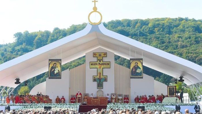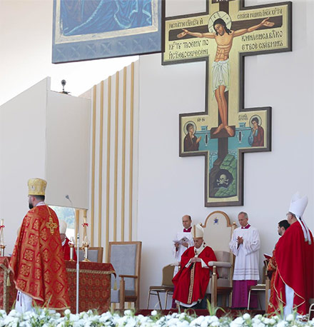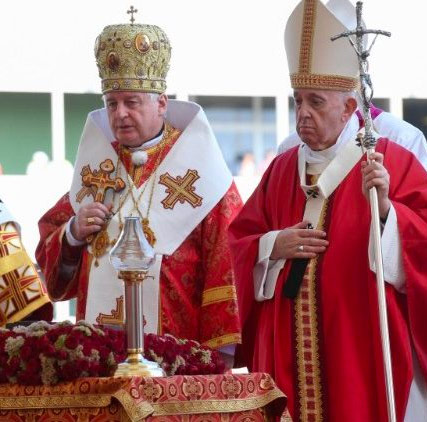 Esta mañana Francisco preside la celebración de la Divina Liturgia Bizantina en la fiesta de la Exaltación de la Santa Cruz. Miles de fieles están presentes en la plaza de la Mestská športová hala de Prešov.