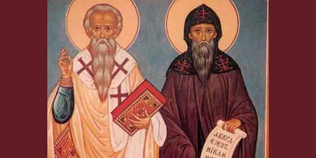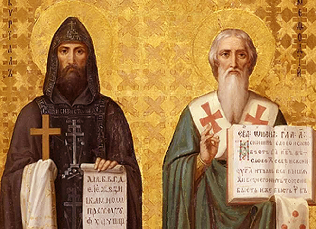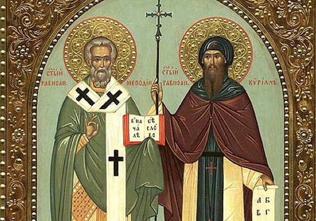 Martirologio Romano: Memoria de los santos Cirilo, monje, y Metodio, obispo, hermanos nacidos en Tesalónica, que fueron enviados a Moravia por el obispo Focio de Constantinopla para predicar la fe cristiana, y allí inventaron signos propios para traducir del griego a la lengua eslava los libros sagrados. En un viaje que hicieron a Roma, Cirilo, que antes se llamaba Constantino, enfermó y, habiendo profesado como monje, descansó en el Señor en este día († 869). Metodio, constituido obispo de Sirmium por el papa Adriano II, evangelizó toda la región de Panonia, y en todas las dificultades que tuvo que soportar fue siempre ayudado por los Pontífices Romanos, recibiendo finalmente el premio por sus trabajos en la ciudad de Velherad, en Moravia, el día 6 de abril († 885).