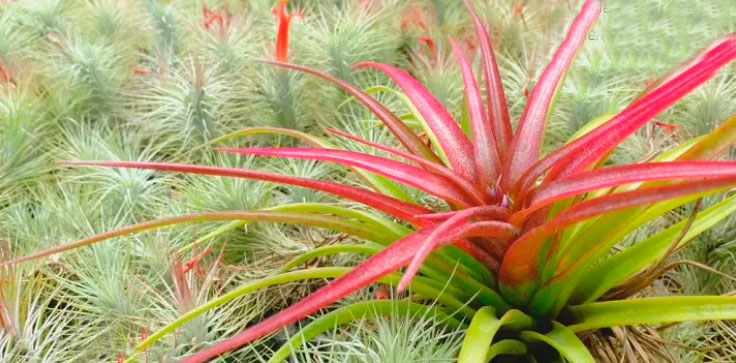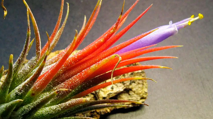 La tillandsia es muy agradecida. Solo con una humedad que a veces puede ser extremadamente baja ya tiene suficiente para vivir. A cambio, esta especie dispone de más 600 variedades y muchas de ellas ofrecen una flor original y vistosa, en colores rojos, fucsias, morados o naranjas. Así, en el periodo de floración aportan un color cálido a la estancia donde se las coloque.