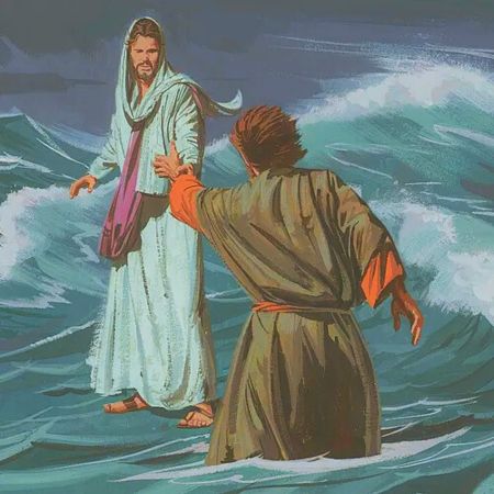 Ahora, en la cuarta vigilia de la noche, es decir, en el momento más oscuro, Jesús viene caminando sobre el mar. Esto es interpretado como una afirmación de su divinidad: del mismo modo que el Espíritu de Dios flotaba sobre las aguas al principio de los tiempos, así también Jesús flota sobre ellas hoy. Y entonces dice a sus discípulos aterrorizados: “Tranquilícense, soy yo; no teman”. Pero más aún que esto, les dice: ustedes pueden participar en mi poder. “Pedro, bajando de la barca, comenzó a caminar sobre el agua en dirección a él”. Esta es la historia de todos los santos.