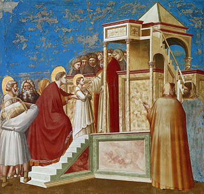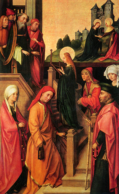 María, según la promesa hecha por sus padres, fue llevada al templo a los tres años, en compañía de un gran número de niñas hebreas que llevaban antorchas encendidas, con la participación de las autoridades de Jerusalén y entre el canto de los ángeles.