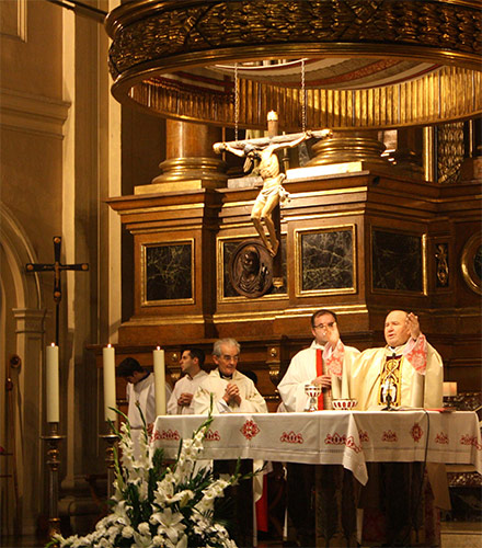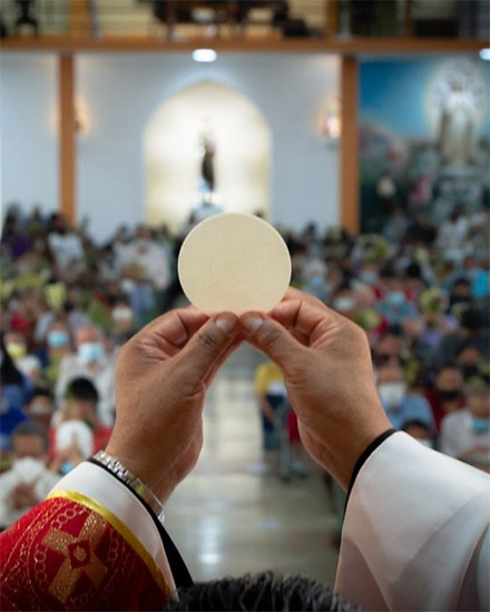 Y lo que se está narrando aquí es esta historia familiar de la multiplicación de los panes, pero lo que se está narrando simbólicamente en verdad, es la misa, es la misa. No vamos a comprender la Eucaristía separada de la Misa, fuera del contexto de la Misa. Así que Juan la desarrolla ahora, sin negar por un minuto que este milagro sucedió en realidad. Quedó tan arraigado en la memoria de los primeros Cristianos, pero él lo presenta de este modo icónico que saca a relucir las diferentes dimensiones de la Misa. Este es el comienzo mismo, los versículos iniciales de Juan capítulo seis; “Lo seguía mucha gente, porque habían visto las señales milagrosas que hacía curando a los enfermos. Jesús subió al monte y se sentó allí con sus discípulos”. Miremos ahora a estos elementos, antes que nada, hay una gran multitud siguiendo a Jesús. ¿Cómo venimos a Misa? Es posible que vengan santos a Misa. Es posible que haya alguno justo al comienzo de su vida espiritual, un buscador, pero todos los que vienen a Misa lo hacen porque se dan cuenta que la respuesta está en él. Se dan cuenta que él es el pastor. Son atraídos magnéticamente hacia él. Piensen ahora en la multitud que se acerca a Jesús como la multitud que se reúne para la Misa de domingo. Me ha conmovido durante todos mis años como sacerdote y como obispo, que viene gente que llega de situaciones de la vida diferentes, edades diferentes, contextos diferentes, niveles de educación diferentes, etnias y razas diferentes; todos llegan a la Misa atraídos, si se quiere, por Jesús. Luego “subió al monte”. Por supuesto, la montaña es un tema recurrente en la Biblia para el lugar de encuentro entre Dios y la humanidad, del cielo y la tierra, porque la montaña sube. Es nuestro ascenso a Dios, y es un lugar donde Dios desciende. Piensen en el humo del Monte Sinaí, etcétera; Desde el monte Edén en el Libro del Génesis, el Monte Sinaí, por supuesto, el Monte Tabor, Monte Calvario. Todos estos lugares de encuentro. Bueno, piensen en la Misa, la próxima vez que asistan a Misa, están de un modo sobre todas esas montañas. Es en el Tabor, que sucederá la transfiguración. Sinaí, la ley se puso en marcha, desde ese sitio. Edén, porque es el jardín donde se recobra nuestra vida real. Calvario, porque el sacrificio de Cristo se volverá a presentar.