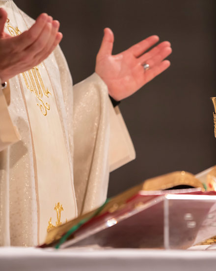 La Misa es el sitio de reunión privilegiado del cielo y la tierra. La multitud se acerca a él y sube a la montaña. Escuchen entonces, “se sentó allí con sus discípulos”. En el mundo antiguo, la posición de sentado era la posición del maestro. Es lo opuesto a lo nuestro. Aquí estoy, por ejemplo, sobre este estrado, estoy de pie, y estoy predicándoles. Cuando era maestro en aquellos años, entraba en el salón, me paraba frente a un podio como este. Los estudiantes se sentaban. Era casi lo opuesto en el mundo antiguo: el maestro no llegaba y se paraba en el estrado, sino que se sentaba y luego los discípulos se distribuían a sus pies. Así que nos referimos a sentarse a los pies del maestro. Bueno, esa es una imagen antigua. No es cierto en la actualidad, ahora diríamos “toma una silla en el salón mientras el maestro da la clase”. Pero en el mundo antiguo, el maestro se sentaba. ¿Qué es la primera parte de la Misa? La liturgia de la palabra. Leemos del Antiguo Testamento, leemos de los Salmos, leemos típicamente de Pablo, luego el Evangelio, por supuesto. Tenemos lectores o diáconos, tal vez, haciendo estas lecturas. Pero, ¿Quién está hablando? Místicamente, es siempre Cristo el que habla. Él es la palabra. Y entonces cada vez que se pronuncia la palabra divina, es Cristo el que habla. En Misa, todos nosotros, como si fuera, nos sentamos a los pies del maestro mientras él enseña. Me sorprende, especialmente ahora que soy obispo de una diócesis, Piensen en eso la próxima vez que asciendan a la montaña para la Misa, y ahora se sientan a escuchar la palabra, están en la postura o en la actitud de estos discípulos. “Viendo Jesús que mucha gente lo seguía, le dijo a Felipe: ‘¿Cómo compraremos pan para que coman éstos?’”. Dice que lo estaba poniendo a prueba. Él sabía, por supuesto. Y luego Felipe dice, “Ni doscientos denarios bastarían para que a cada uno le tocara un pedazo de pan”. Y luego Andrés, “Bueno, aquí hay un muchacho que trae cinco panes de cebada y dos pescados”. Jesús le respondió, “Díganle a la gente que se siente y dénmelos”. Así que a continuación de la liturgia de la palabra, tenemos el credo, lo cual es interesante, porque el credo no es una afirmación abstracta, formal; es el modo en que la gente dice, “Creo en lo que recién he escuchado”. Porque el credo expone la narrativa básica de la salvación. Así que al decir eso, amén al credo, decimos amen a lo que recién escuchamos. Luego se acercan los dones, ¿cierto? Un poco de pan, un poco de vino, un poquito de agua.