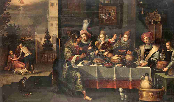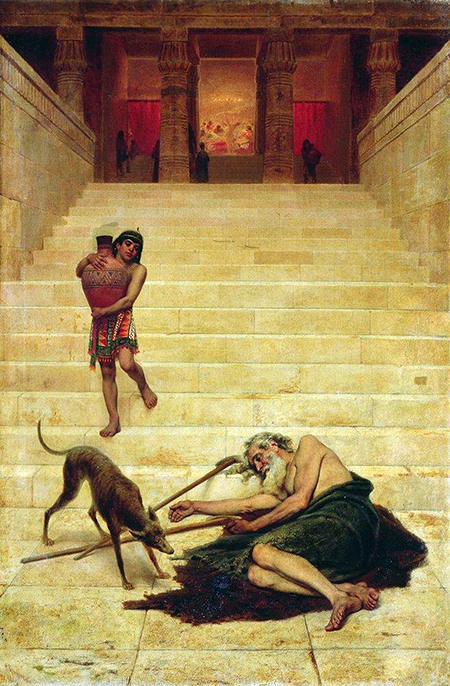 En aquel tiempo, Jesús dijo a los fariseos: “Había un hombre rico, que se vestía de púrpura y telas finas y banqueteaba espléndidamente cada día. Y un mendigo, llamado Lázaro, yacía a la entrada de su casa, cubierto de llagas y ansiando llenarse con las sobras que caían de la mesa del rico. Y hasta los perros se acercaban a lamerle las llagas.