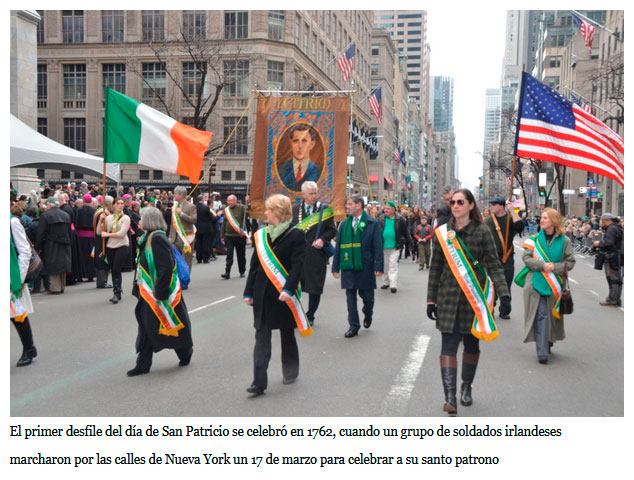 El primer desfile del día de San Patricio se celebró en 1762, cuando un grupo de soldados irlandeses marcharon por las calles de Nueva York un 17 de marzo para celebrar a su santo patrono. Ya para 1848, el desfile se había convertido en un evento oficial de la ciudad, que hoy día atrae a más de tres millones de personas.