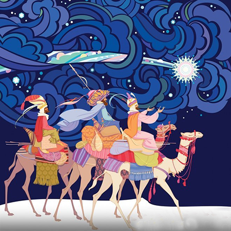 Regiamente ataviados y montados en un camello, caballo y elefante, emprenden el viaje para adorar al Niño.