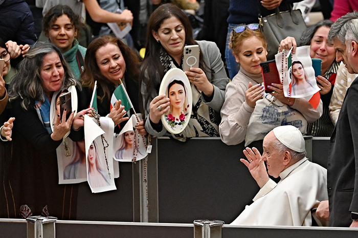 El Papa Francisco saluda a los fieles al final de la audiencia general semanal en el Aula Pablo VI del Vaticano el 22 de febrero de 2023