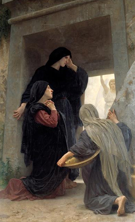 Estando ellas todas desconcertadas por esto, se les presentaron dos varones con vestidos resplandecientes. Como ellas se llenaron de miedo e inclinaron el rostro a tierra, los varones les dijeron: «¿Por qué buscan entre los muertos al que está vivo? No está aquí; ha resucitado. Recuerden que cuando estaba todavía en Galilea les dijo: ‘Es necesario que el Hijo del hombre sea entregado en manos de los pecadores y sea crucificado y al tercer día resucite’ «. Y ellas recordaron sus palabras.