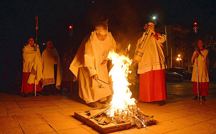 Al iniciar la celebración, el sacerdote apaga todas las luces de la Iglesia, enciende un fuego nuevo y con el que prende el cirio pascual, que representa a Jesús. Sobre el cirio, marca el año y las letras griegas «Alfa» y «Omega», que significan que Jesús es el principio y el fin del tiempo y que este año le pertenece.