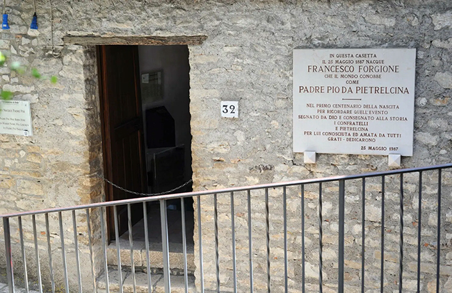 Francesco Forgione nació el 25 de mayo de 1887 a las 17:00h en Pietrelcina, en la provincia italiana de Benevento, en la pequeña calle Storto Valle en el número 27.