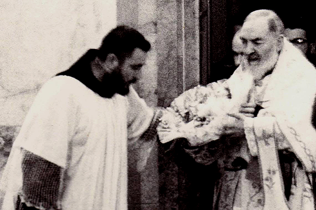 Años más tarde, en San Giovanni Rotondo, siendo ya padre anciano, se inclinó para besar las manos sangrantes de los estigmas del Padre Pío.