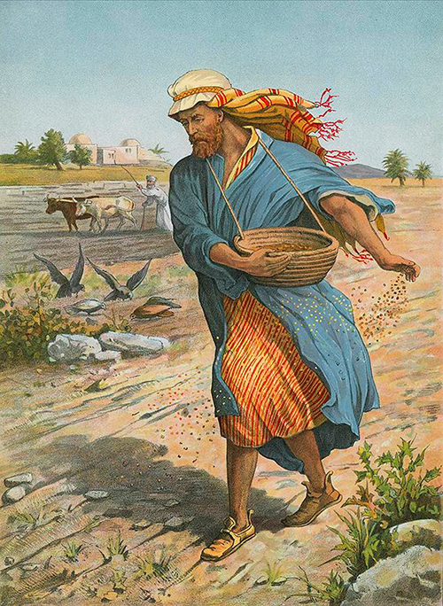 “Salió un sembrador a sembrar su semilla. Al ir sembrando, unos granos cayeron en el camino, la gente los pisó y los pájaros se los comieron. Otros cayeron en terreno pedregoso, y al brotar, se secaron por falta de humedad. Otros cayeron entre espinos, y al crecer éstos, los ahogaron. Los demás cayeron en tierra buena, crecieron y produjeron el ciento por uno”. Dicho esto, exclamó: “¡El que tenga oídos para oír, que oiga!”.