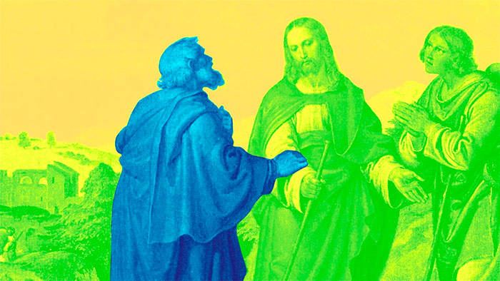 Se les unió un caminante como compañero de camino. Ellos temían «ofuscada la mirada». Al preguntar qué les pasa, Cleofás con tono enojado casi le regañó por no estar al día de lo que ha pasado en la Ciudad Santa. Cuando resumen los hechos tan trágicos e impresionantes, el viajero les recordó que ya estaba previsto por los profetas.-